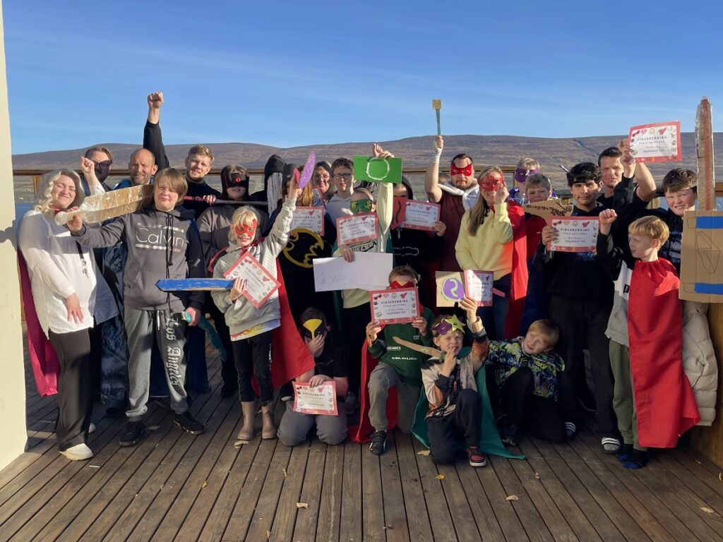 Eftir hádegi seinni daginn fóru fram spennandi hetjuleikar þar sem nemendur kepptu í fimm skemmtilegum greinum. Flestir klæddust skikkjum og grímum sem þau höfðu búið til og báru áhöld sem tilheyrði hetjunum þeirra. Keppt var í :